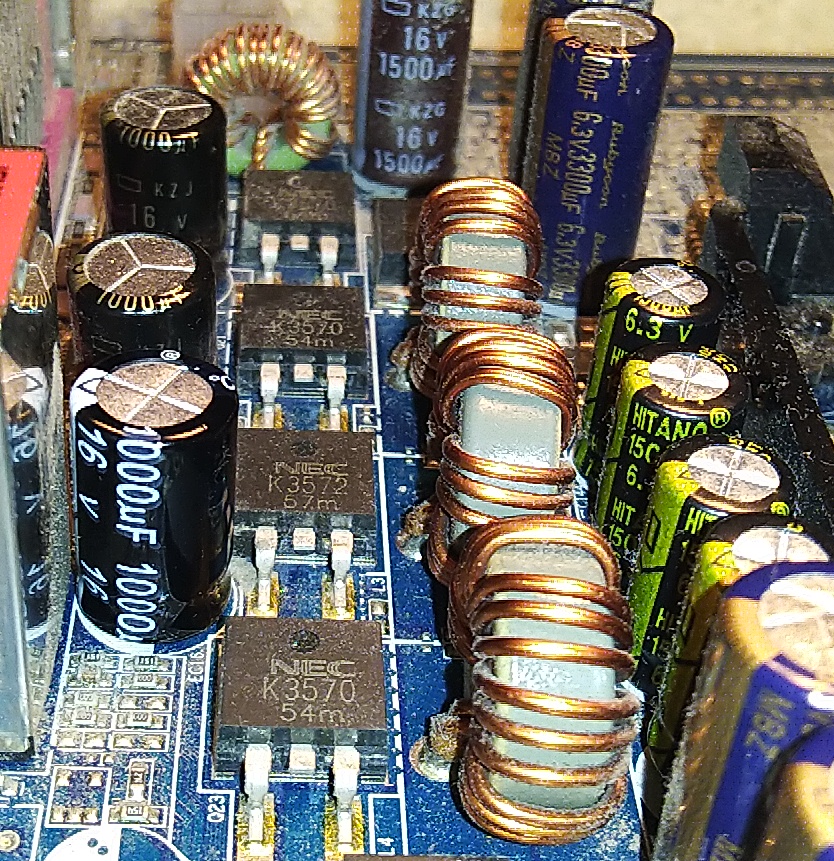 By the way, yellow capacitors Hitano 1500uf 6.3v on the right side of image is totally new. I soldered them recently as replacement to old "swollen" caps, back then I did visual check to rest capacitors near, looking if they need replacement as well, and they were fine! Well one, now, is literally exploded.